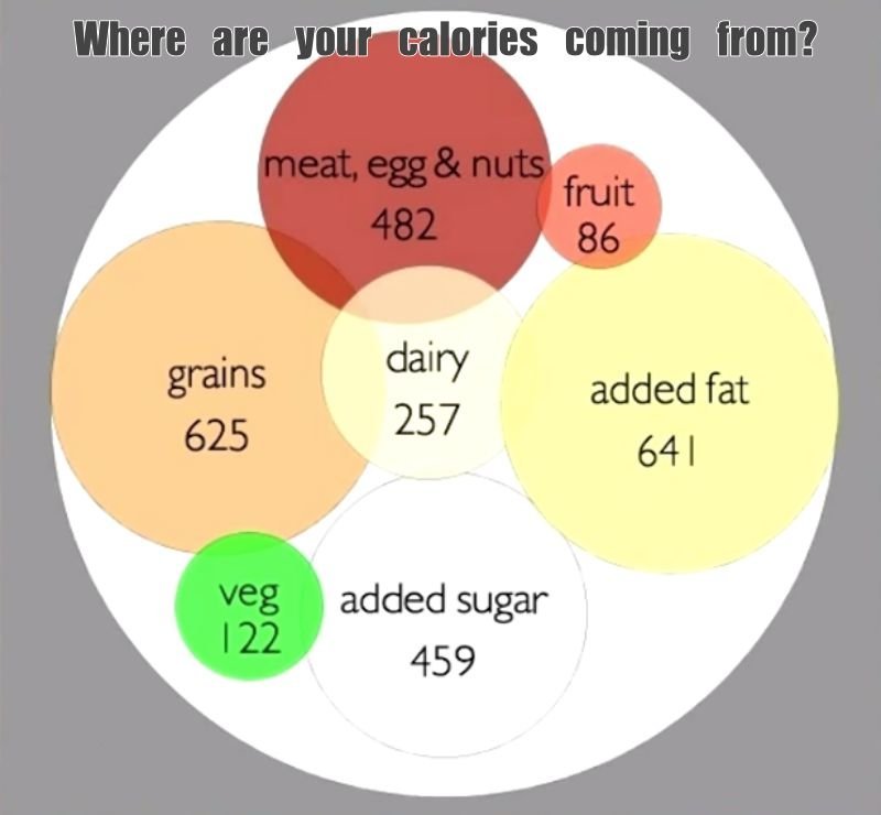 There’s a chart in the picture below that shows the different sources of caloric intake in the average American diet. It was created based on data from the USDA ( U.S. Department of Agriculture ) and it was created by a group called Civil Eats and The University of Berkeley School Of Journalism. It’s based on data from 2008 because that’s the most recent data that was available.