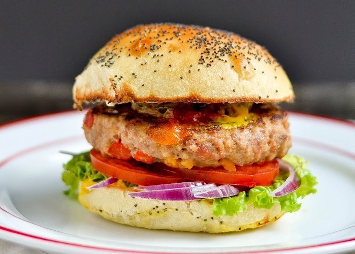 Then you mix together all the ingredients in a large bowl, until they are mixed well. Form this into 5-6 smaller patties, or 4 bigger ones. Place the patties on the grill and cook for about 5 minutes on each side or until they are done.