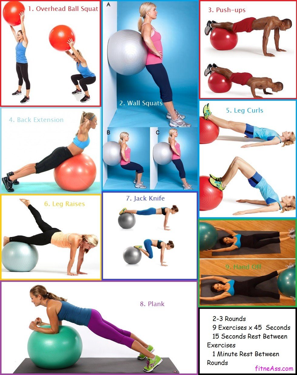 There are 2 rounds of a total of 9 exercises, 45 seconds per exercise with 15 seconds of rest. This Swiss Ball workout will take 20 minutes from your time, but it will put all your muscles to work: