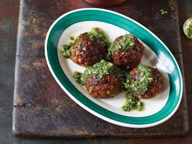 Roast lentil balls until firm and cooked through, about 30 minutes. Allow the meatballs to cool for five minutes before removing from the tray. Serve with pesto (see the recipe below).