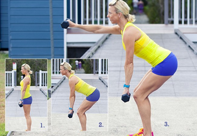 Execution: Stand up with your back straight and hold a dumbbell in each hand. Bend your knees and lift your right arm until it’s parallel to the floor. Bring it down slowly and lift the other arm. Keep in mind that you must maintain your back straight all the time. Do not do this exercise if you have problems with column (lumbar area).