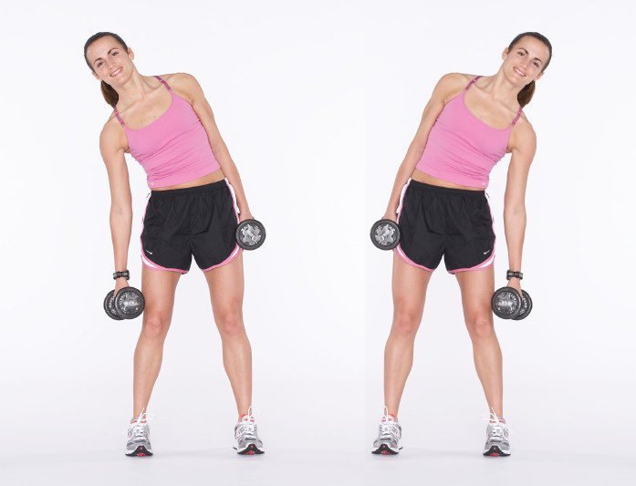 Execution: Standing up with the column straight, keep you feet shoulders-width apart. Grab in each hand a dumbbell of 2 kg. Perform lateral bending and lifting light for each side. Caution! Do not move the whole body, but only the upper body.