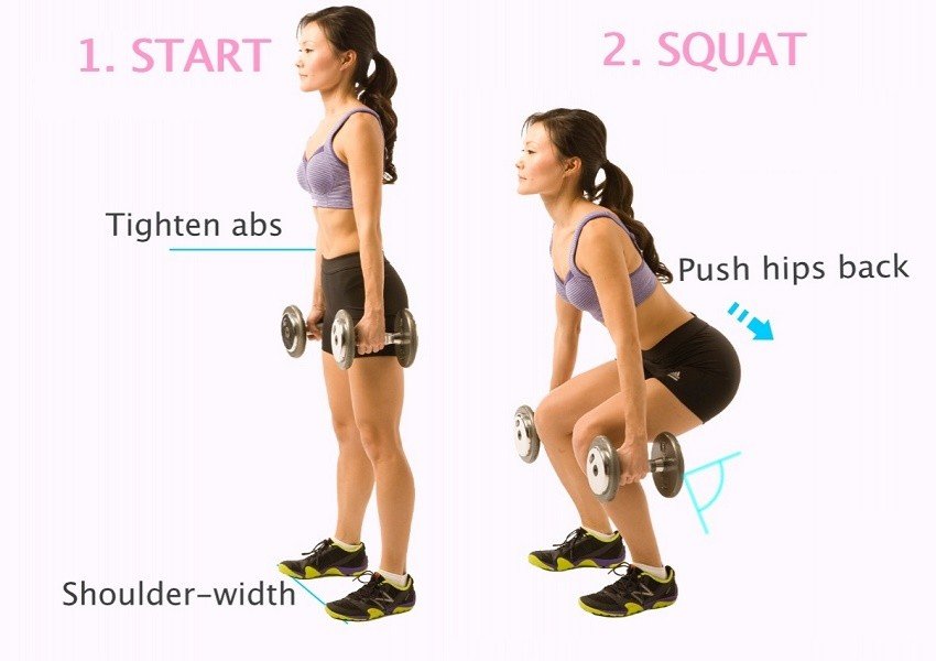 Execution: Stand straight with your feet shoulder-width apart and buttocks little bit out. Grab a dumbbell in each hand. Squat gently until the buttocks are parallel to the ground and then stand up easily.