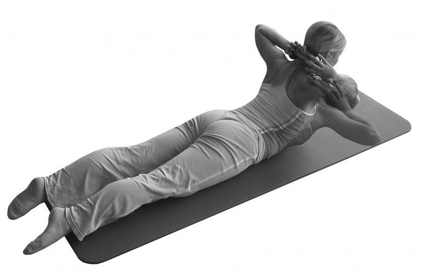 Execution: Lie down on your belly. Put your hands behind your head. The legs are slightly apart and stretched back. Raise your torso and legs simultaneously, without forcing your column.