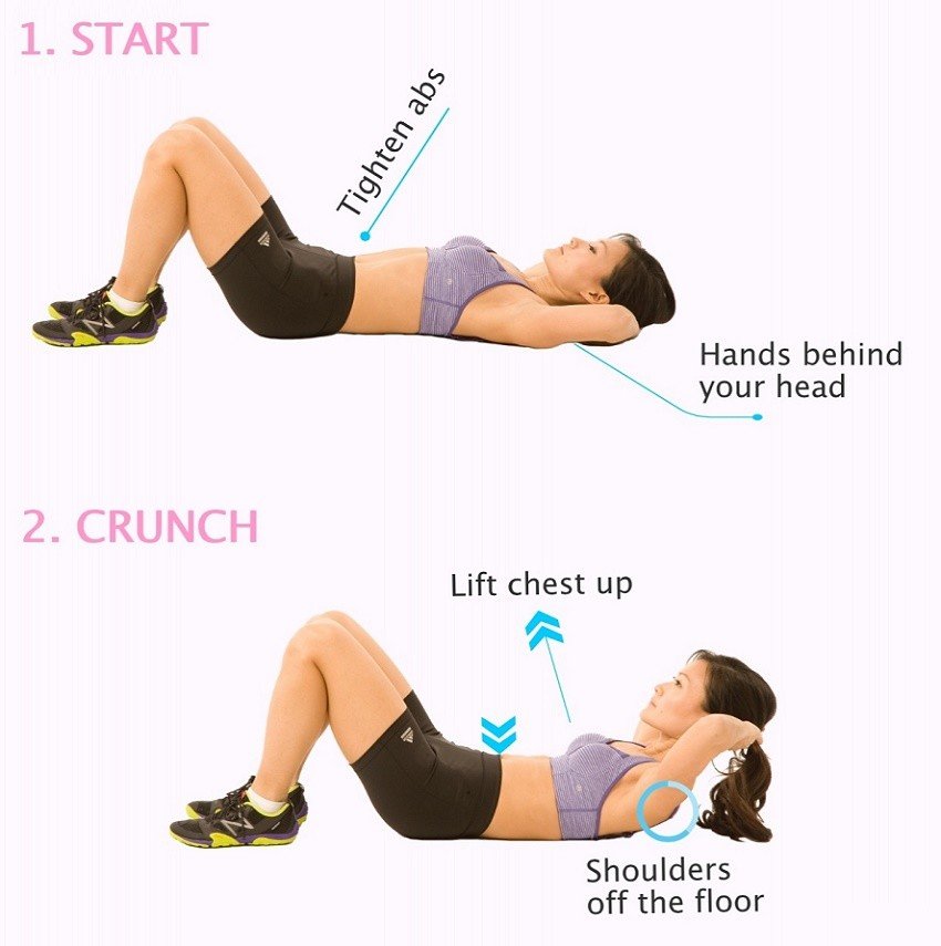 Execution: Lie on the floor with legs bent at 90 degrees, mounted on a chair, a bed or special ball. Keep your hands behind your head and look to the ceiling. Lift slightly your torso and then lower it back down. Inhale on the ascent and exhale on the descent.