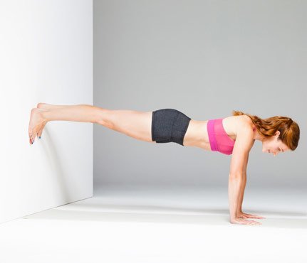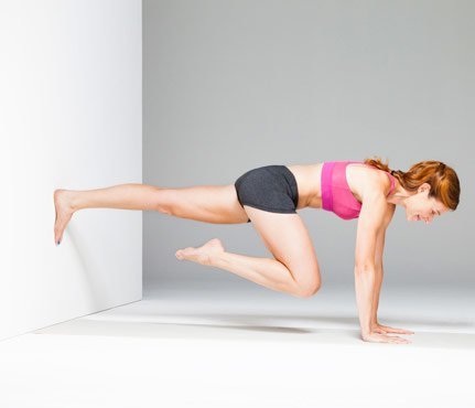 Stand facing wall about a foot away, arms extended and hands on wall, left knee raised to hip level. Keep elbows in line with shoulders and lean forward until forearms rest on wall as you extend left leg back (as shown). Reverse for 1 rep. Do 10 reps, switch legs and repeat. This wall exercise will work your buttocks,hips,hamstrings, chest and abs.