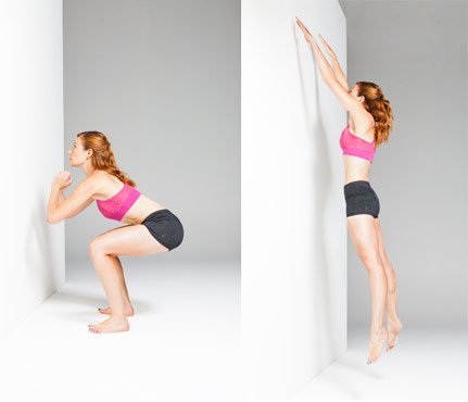 Do just the previous seven moves and you’ll firm up. Add this squat jump for 1 minute between each and you’ll also torch serious calories. Face wall and squat deeply. We’re talkin’ thighs-parallel-to-floor deep! Then spring up. As you jump, look up and lightly touch the wall as high as you can with both hands. No rest between reps!
