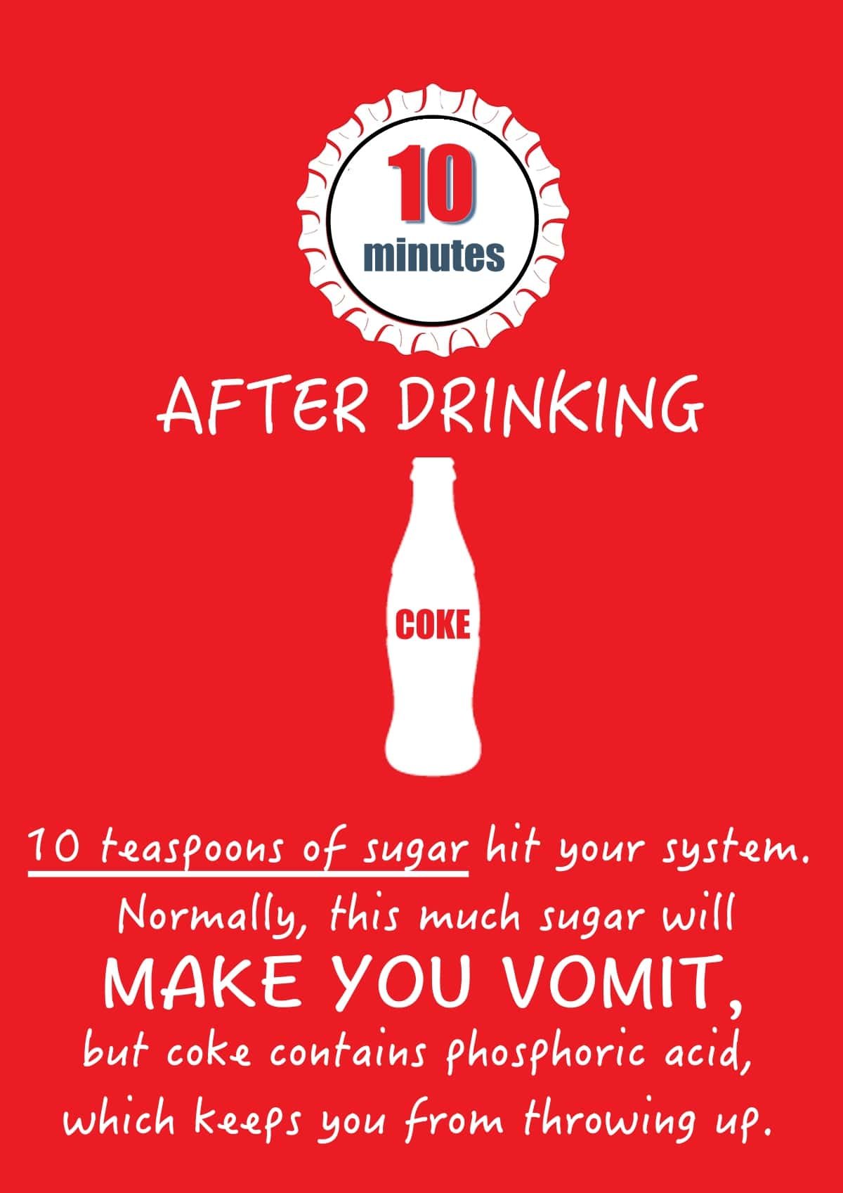 In the first ten minutes after drinking coke (a full can of coke), your body gets about half of the recommended daily intake of sugar (39 grams from 90 grams recommended).