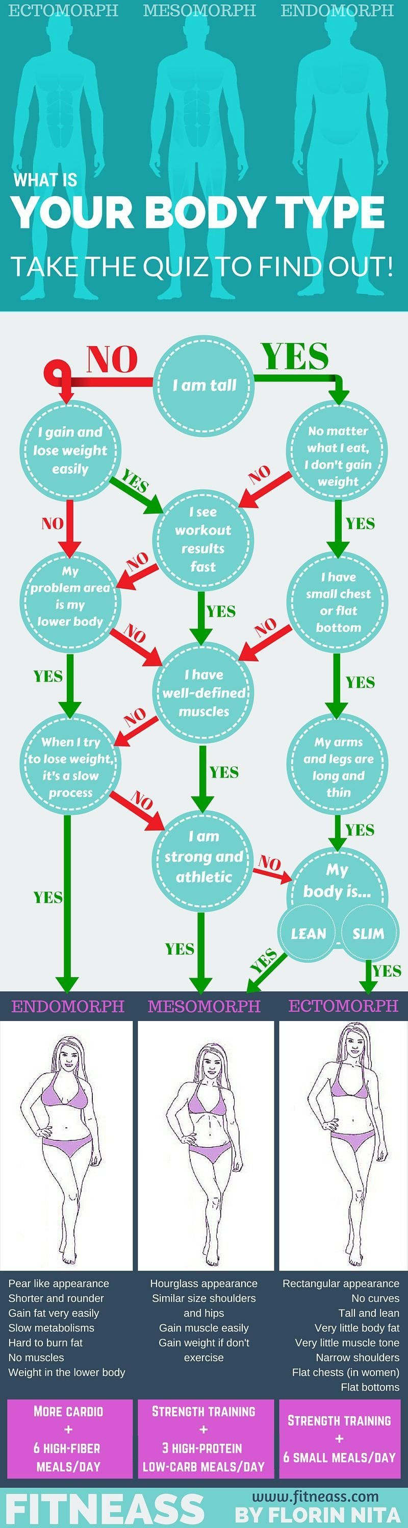 In the infographic below you can find an easy quiz to determine what is your body type. Take the quiz and follow the training and nutrition tips provided for your body type. Stay fit!